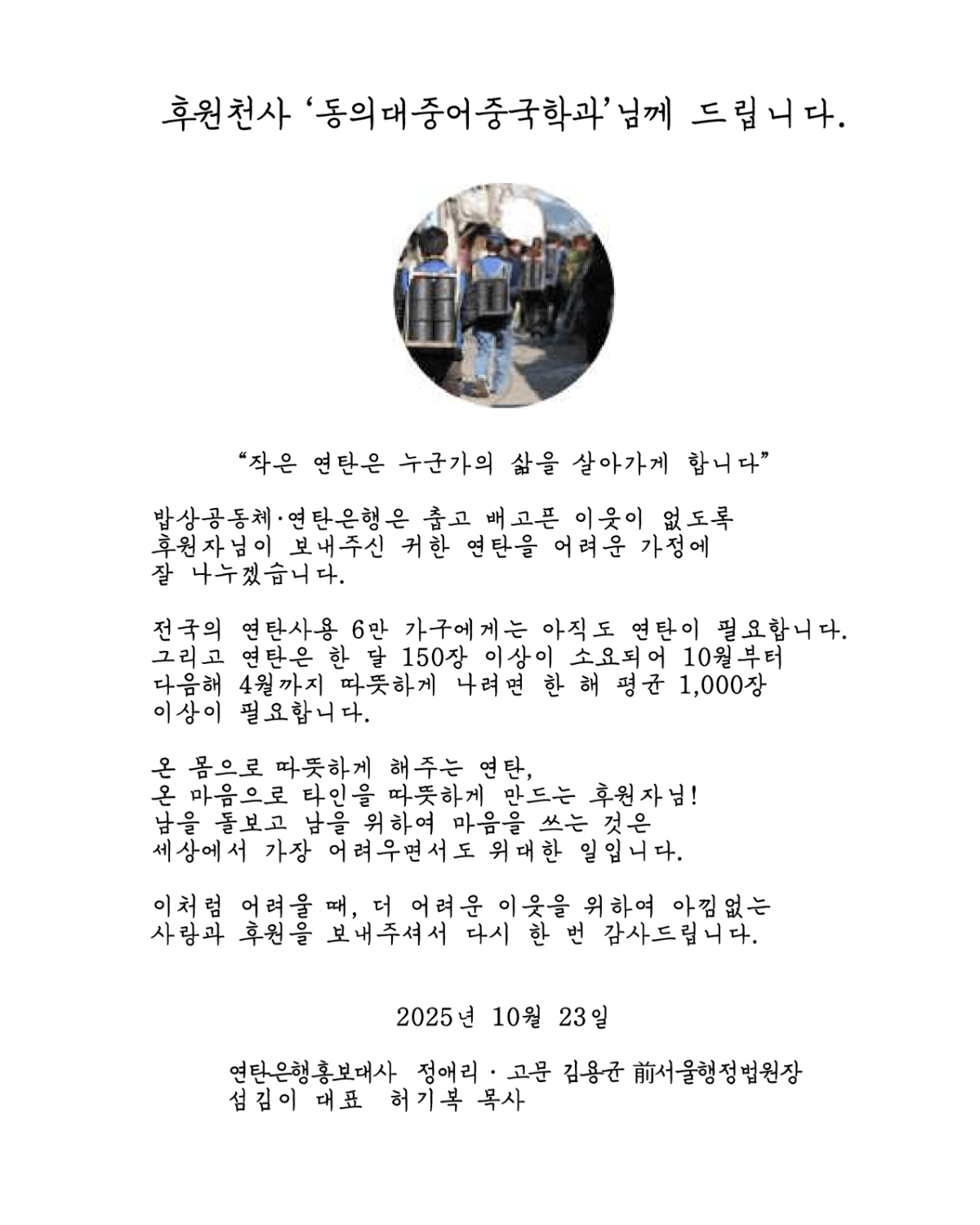 중어중국학과 학생회 일일매점 수익 기부 ( 연탄은행)